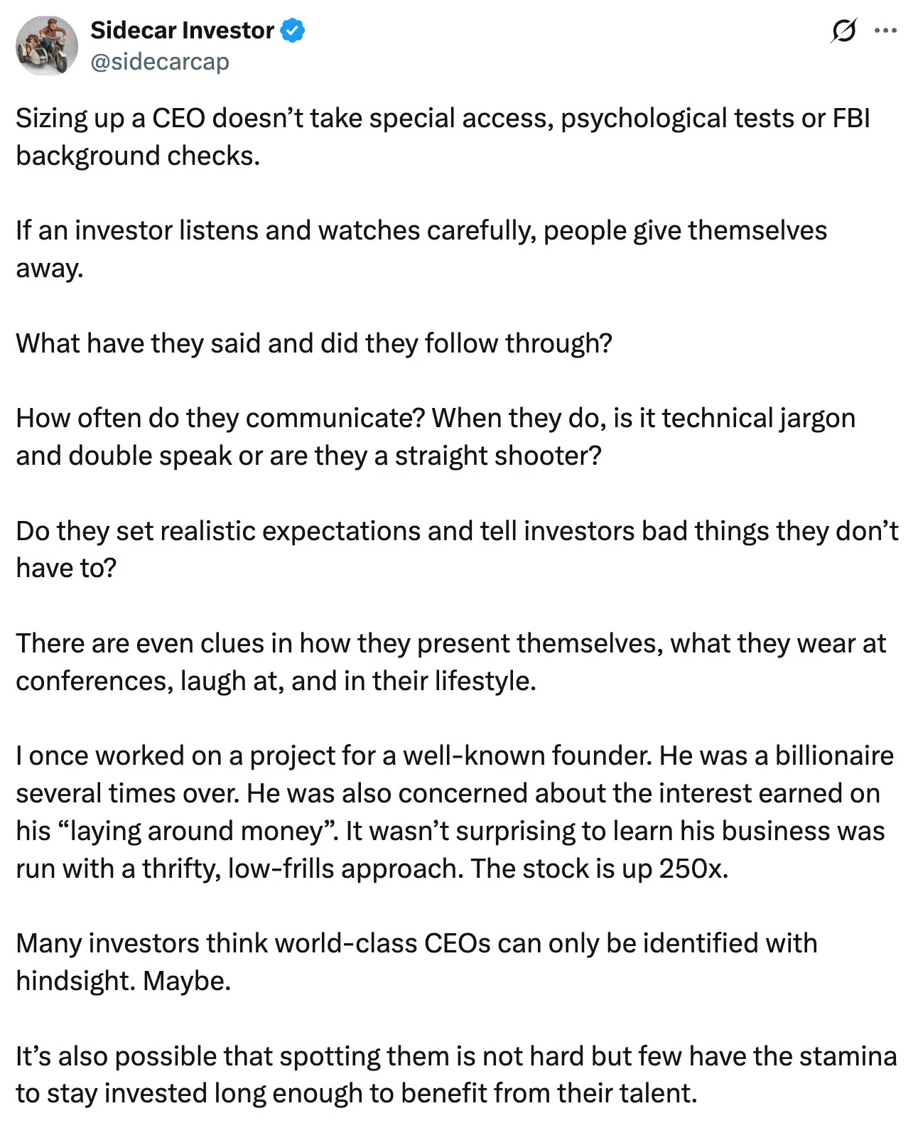 “How often do they communicate? When they do, is it technical jargon and double speak or are they a straight shooter? Do they set realistic expectations and tell investors bad things they don't have to? There are even clues in how they present themselves, what they wear at conferences, laugh at, and in their lifestyle.”