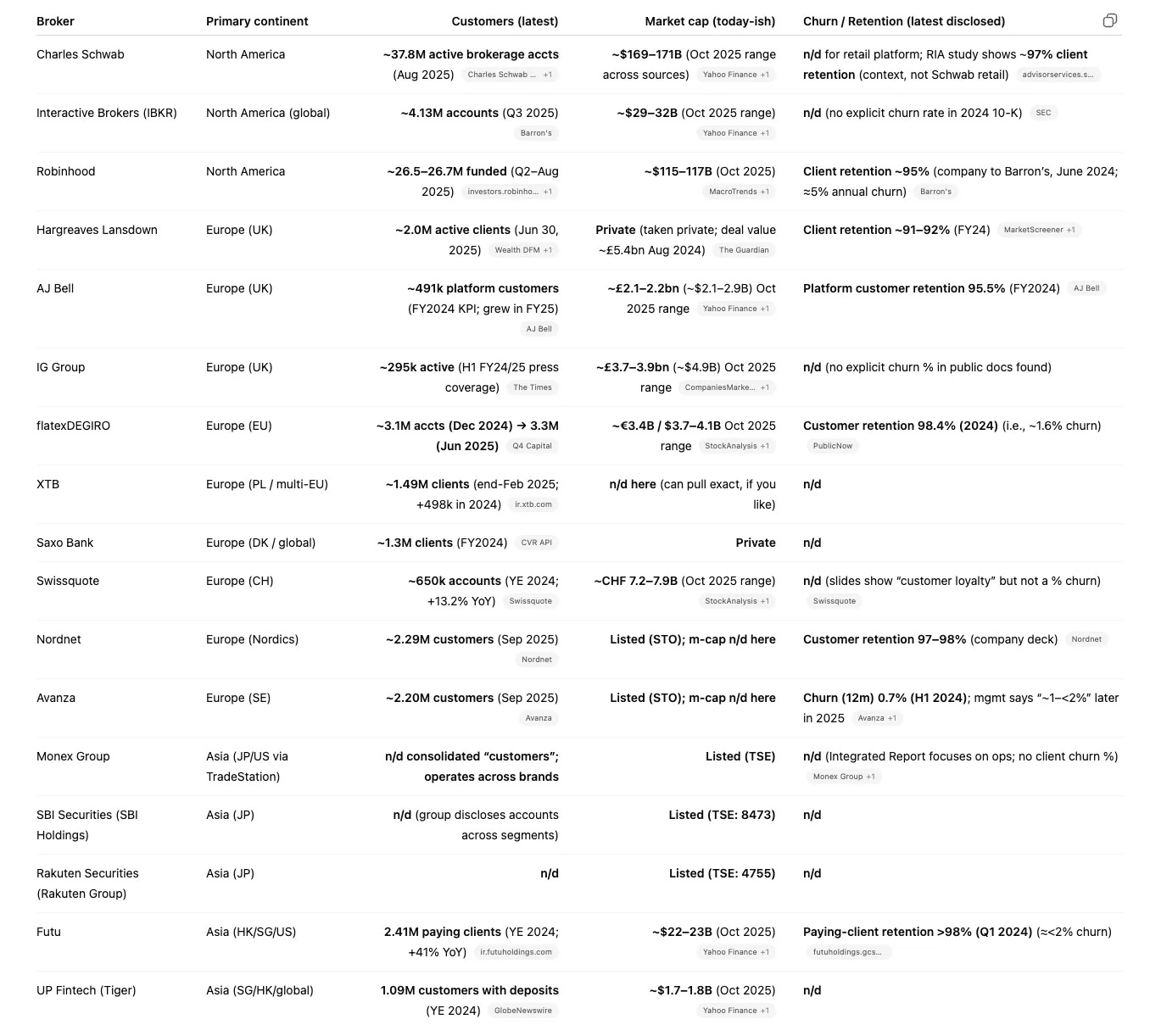 Here’s an overview of some well-known brokerage businesses and their corresponding churn/retention rates: