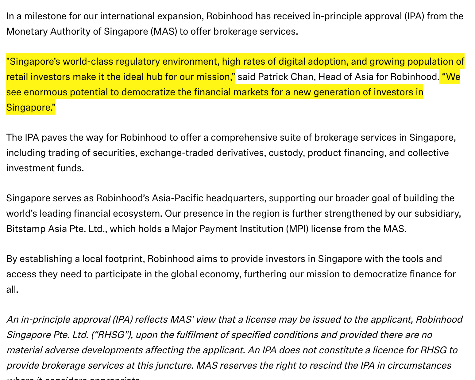 It is finally official. After months of signaling its intentions to expand into the Asia-Pacific region, Robinhood has secured in–principle approval (IPA) from the Monetary Authority of Singapore (MAS) to offer brokerage services.