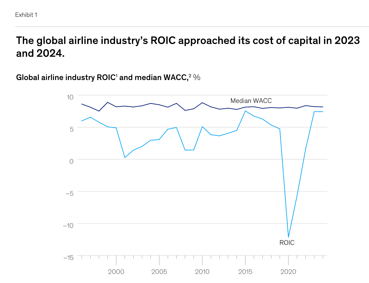 “Airline sector ROIC in aggregate has been below its cost of capital since at least 1996, which is the earliest data point in our research (Exhibit 1). Many of the structural factors underlying this poor result remain: Airline passengers are typically very price sensitive, the industry features strong competition paired with low barriers to entry and high barriers to exit, and the regulatory landscape can pose challenges to consolidation. But in 2023 and 2024, results improved. The annual differences between ROIC and WACC, at the sector level, were among the narrowest we’ve seen in the history of our research.“ – McKinsey “Can the global airline industry continue its climb?“