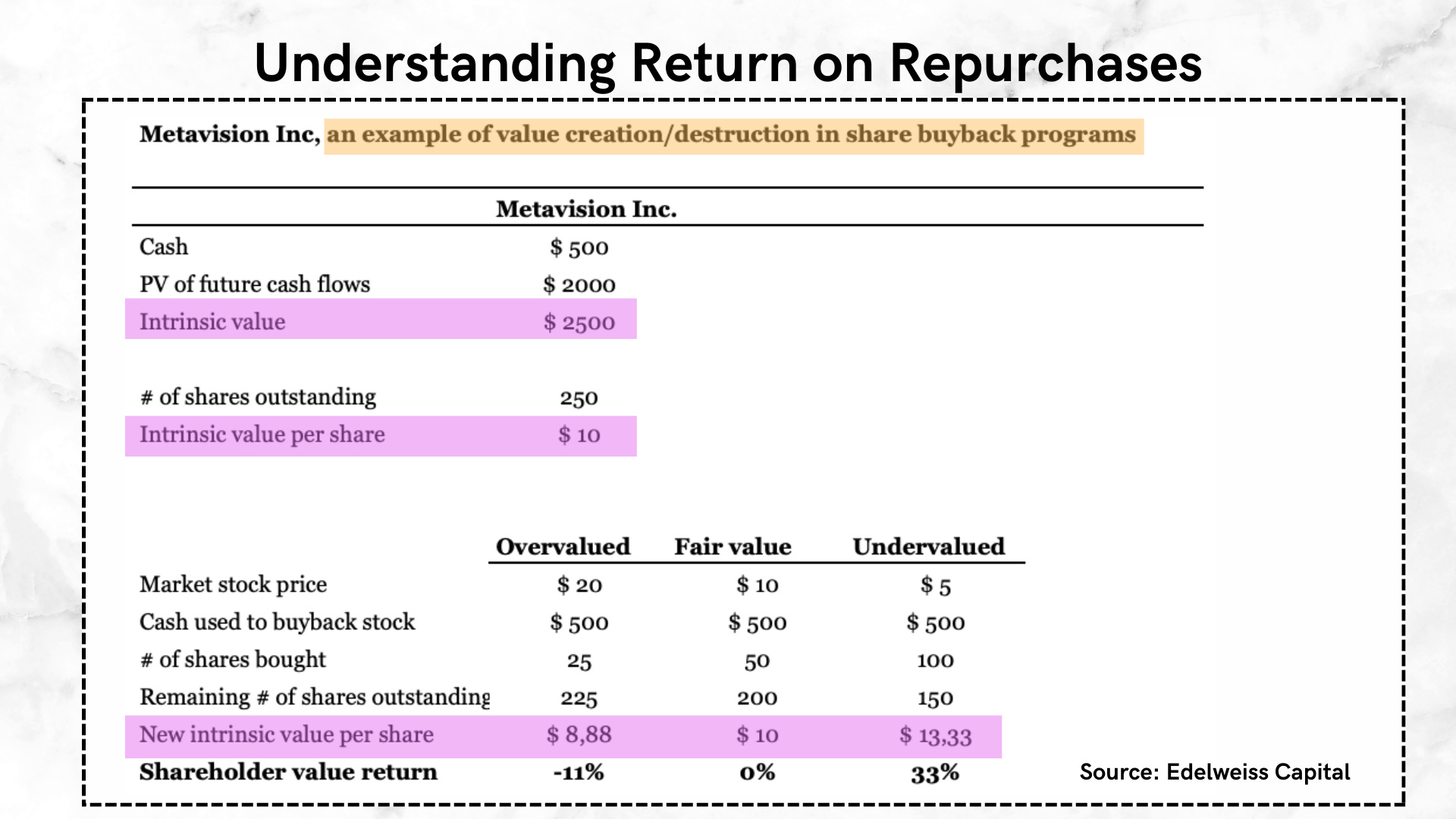 To make this more tangible, I like to share some simple buyback math – and the illustration below of the fictional company “Metavision Inc.” (credits go to Javier Pérez from Edelweiss Capital).