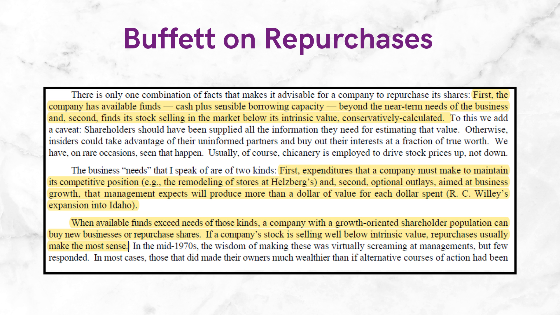 Buybacks make sense when two conditions align. First, the stock must trade at a meaningful discount to intrinsic value. Second, the company must lack reinvestment opportunities offering comparable or better risk-adjusted returns. That combination is rare, because truly great businesses often have abundant ways to reinvest capital at high incremental returns.