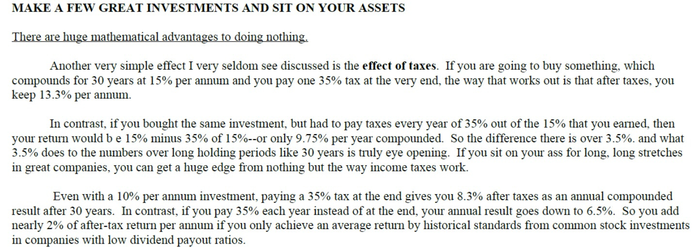 He has frequently highlighted how taxes and transaction costs can diminish long-term returns. For example, a 15% compounded annual growth rate (CAGR) could easily fall below 10% after taxes, depending on your jurisdiction and trading activity: