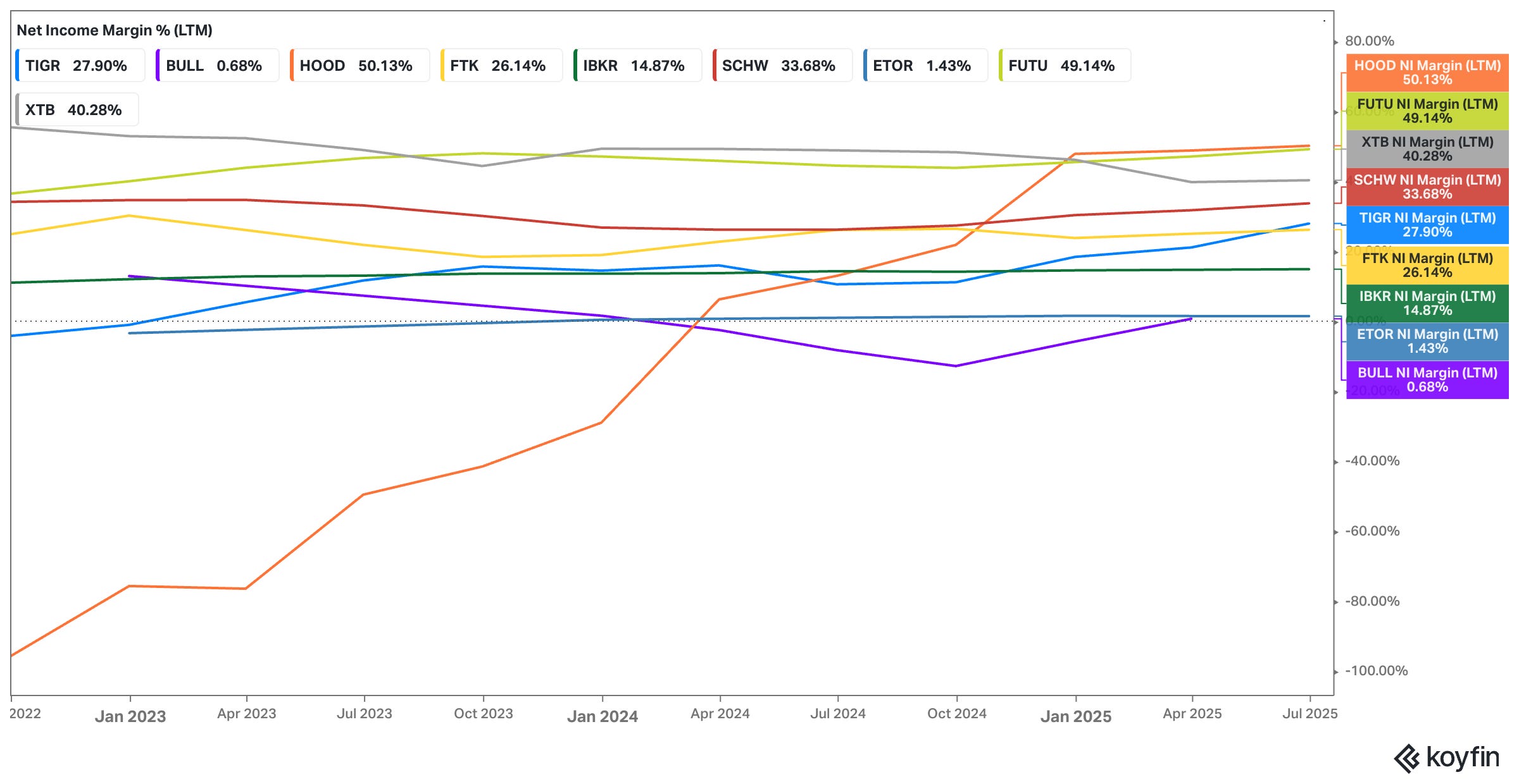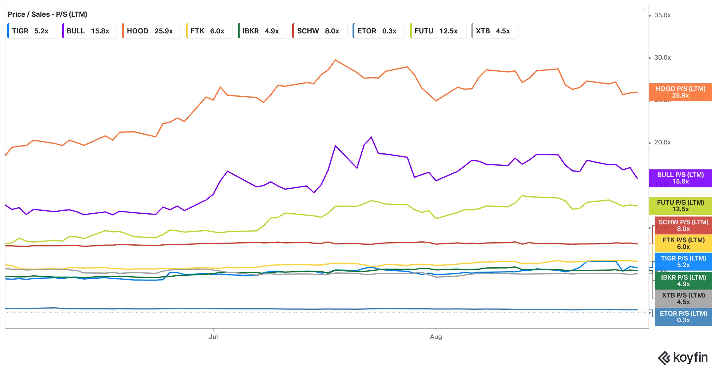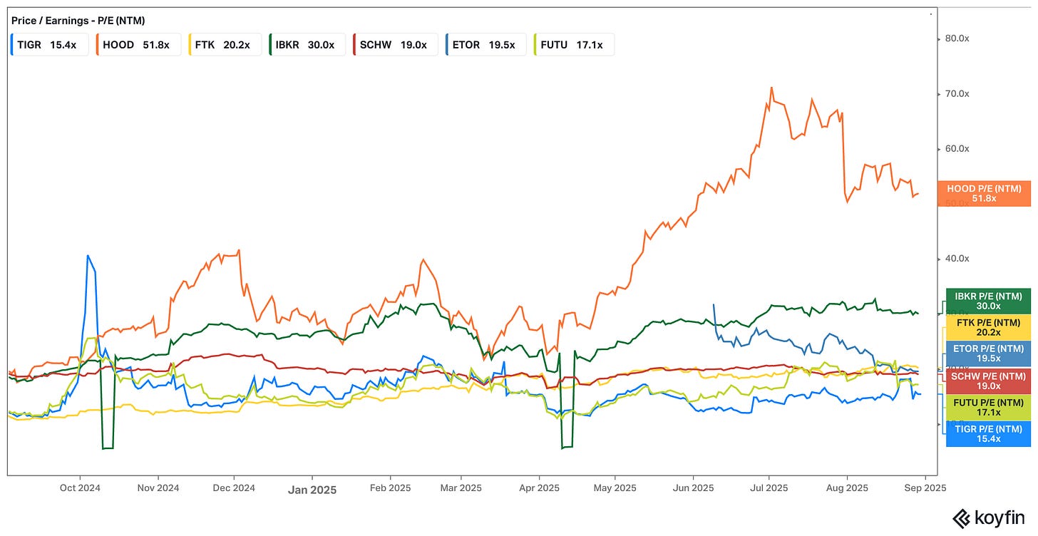 On a P/E basis, the gap is even more glaring. Tiger sits at 15.4x forward earnings (Koyfin figures), while Robinhood commands over 50x, Webull nearly 16x, and IBKR about 30x.