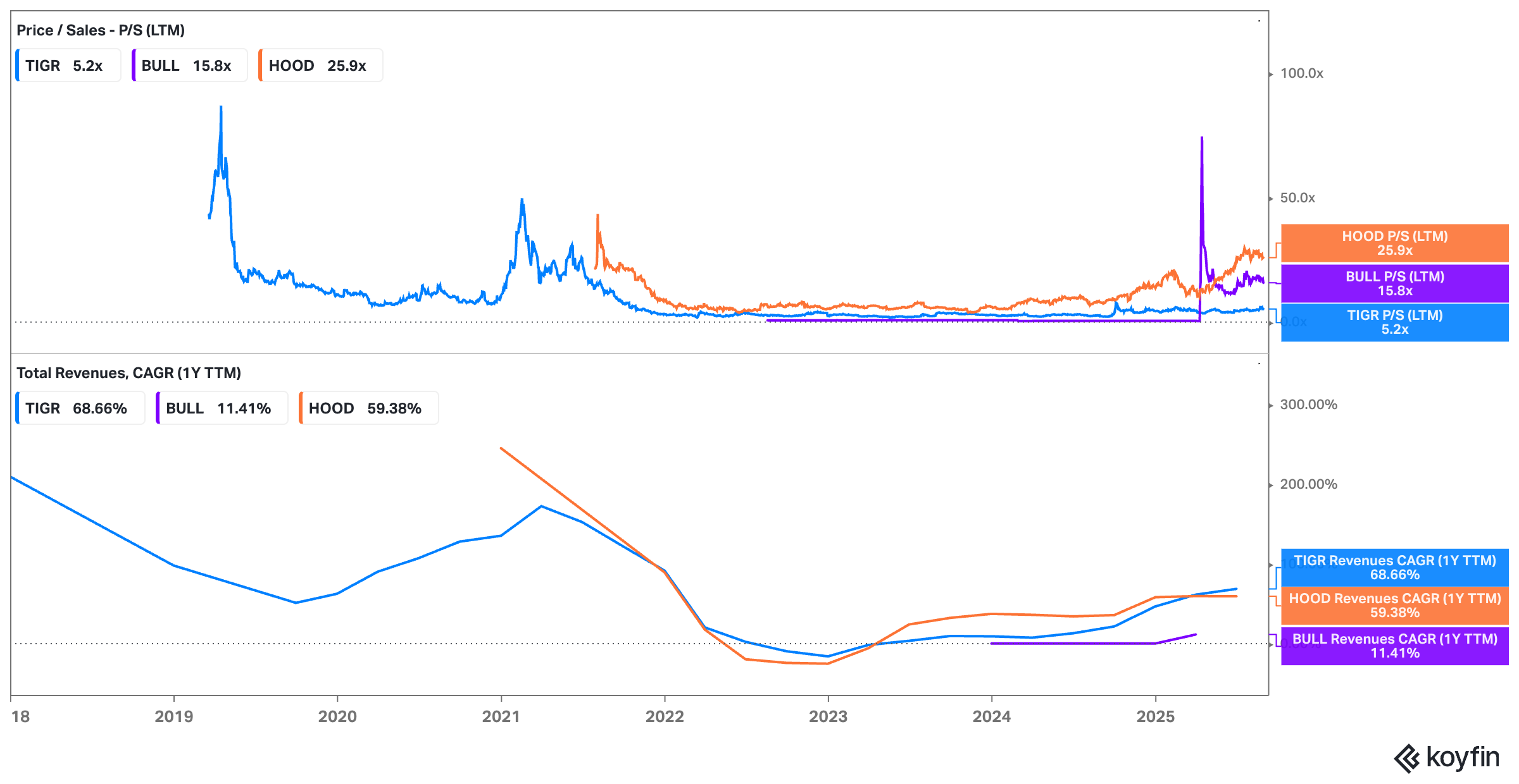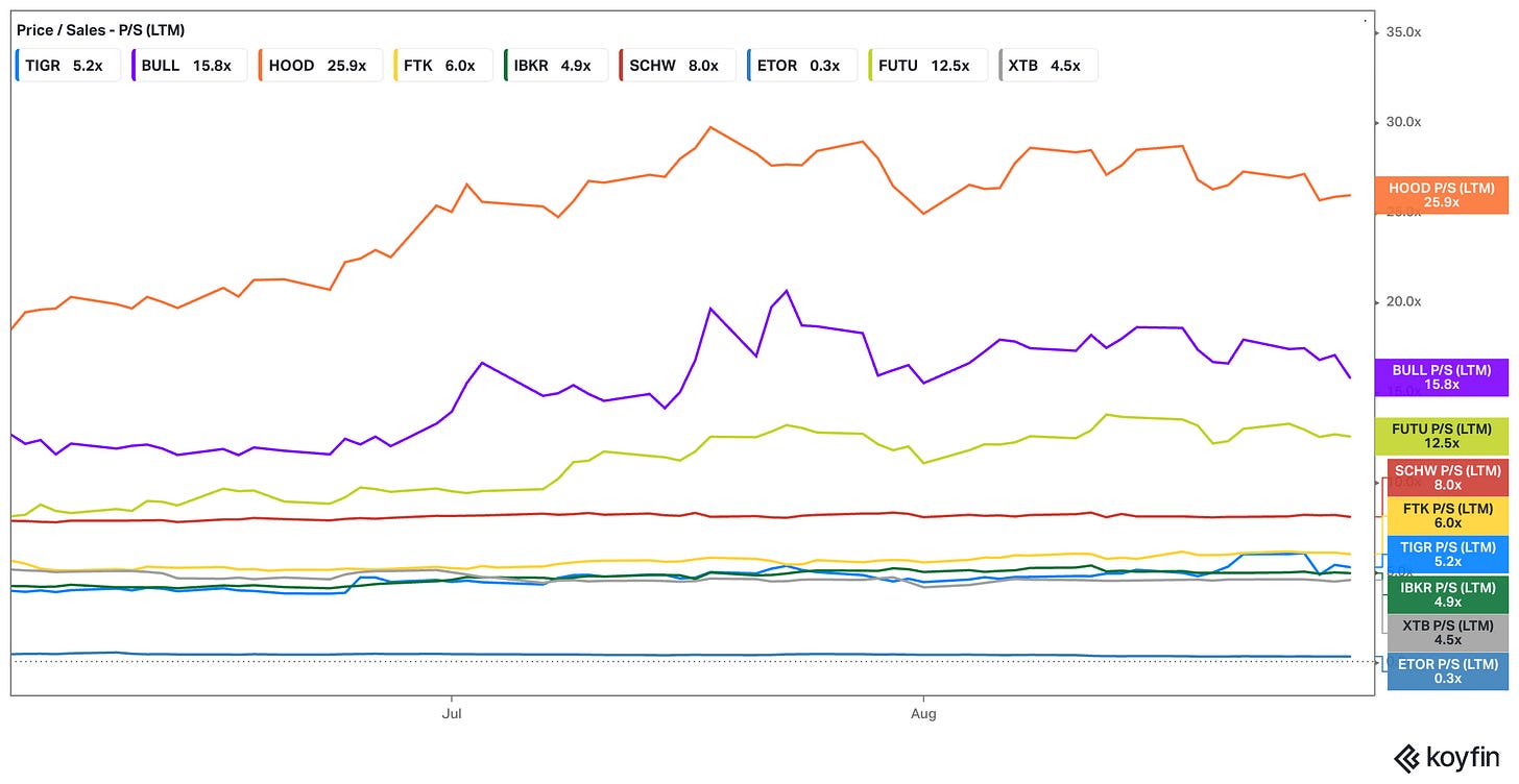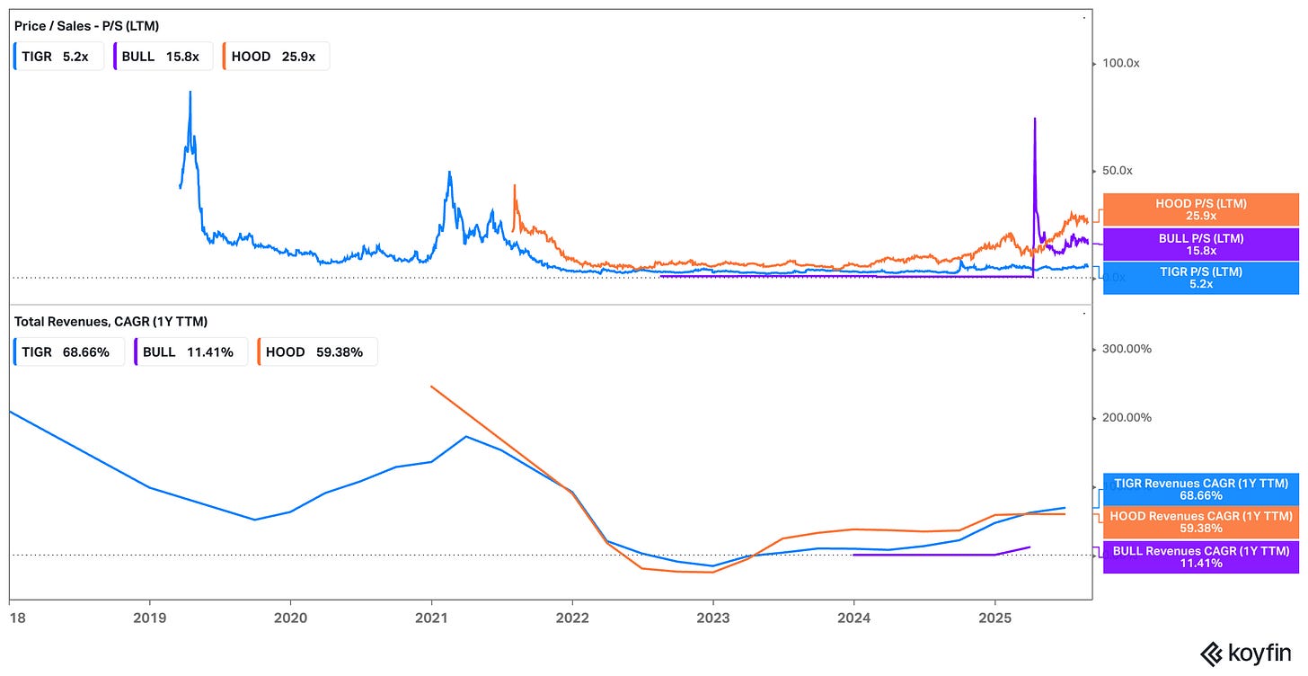 Looking at Tiger in isolation, the low-teens multiple already looks appealing. But the case becomes stronger when I compare it against listed peers. On a price-to-sales basis, Tiger trades at around 5.2x, versus 15.8x for Webull (BULL) and an eye-watering 25.9x for Robinhood (HOOD).