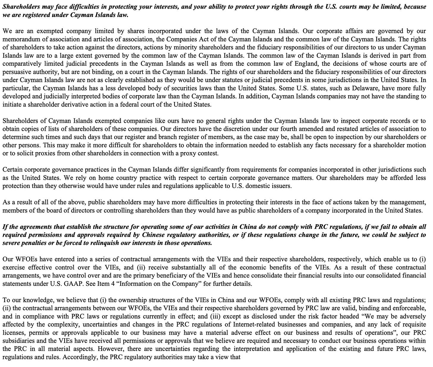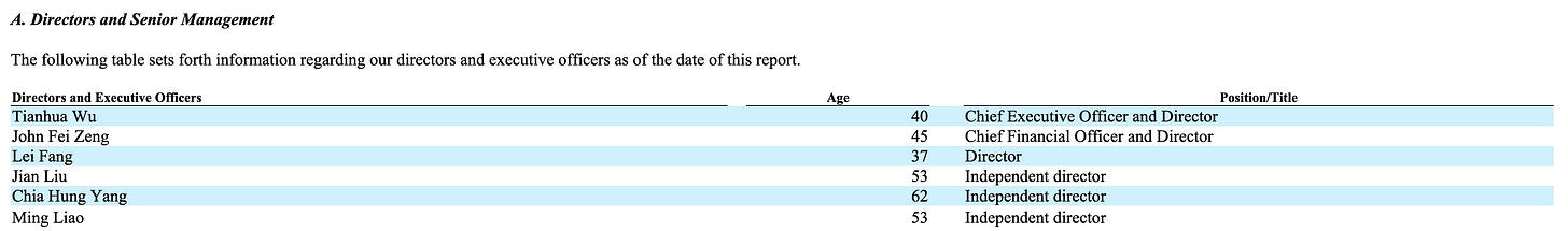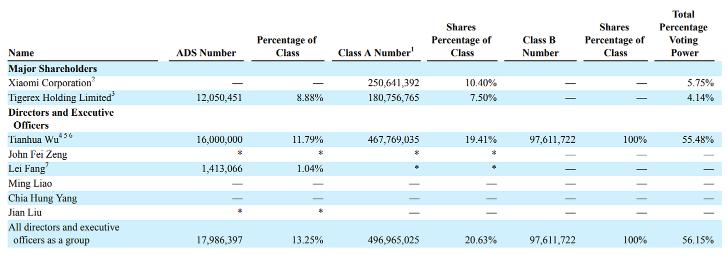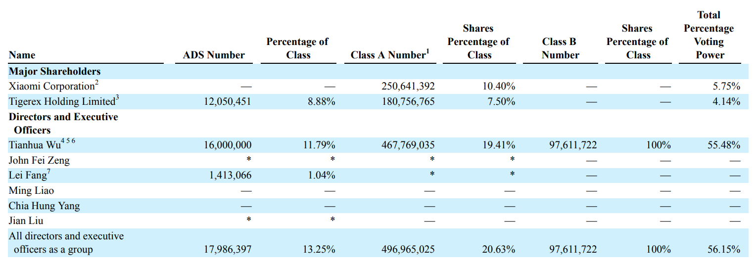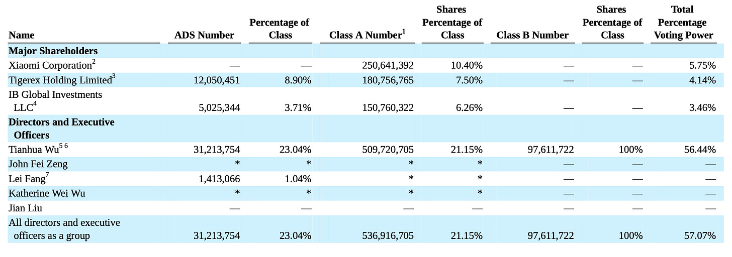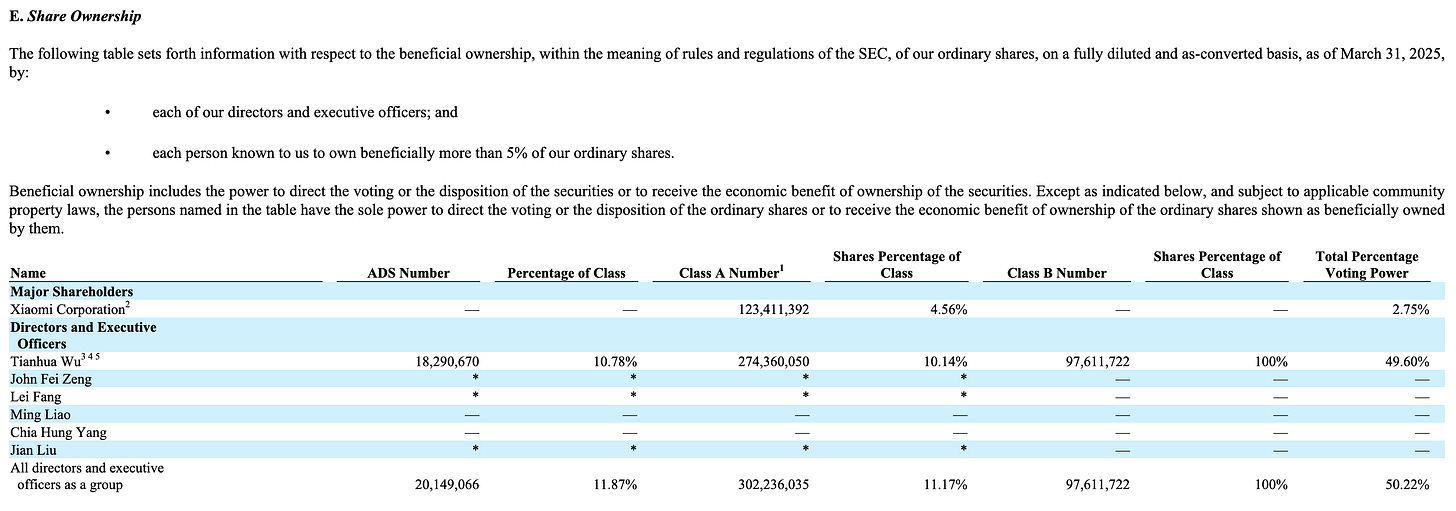As of March 31, 2025, founder Tianhua Wu and his family owned all the Class B stock, representing only 3.5% of the total share capital but controlling over 43% of the voting power. That gives him effective veto rights over any major corporate action – mergers, director elections, strategic pivots – and significantly limits the influence of ordinary shareholders. The annual report is blunt about this: such control could prevent a change of control transaction or deprive ADS holders of a takeover premium.