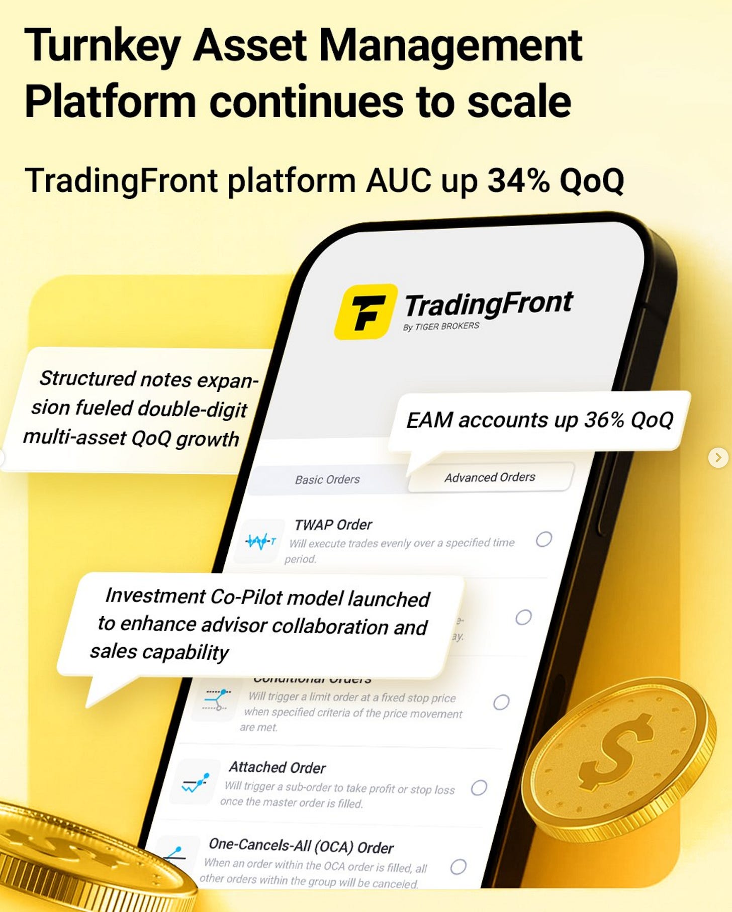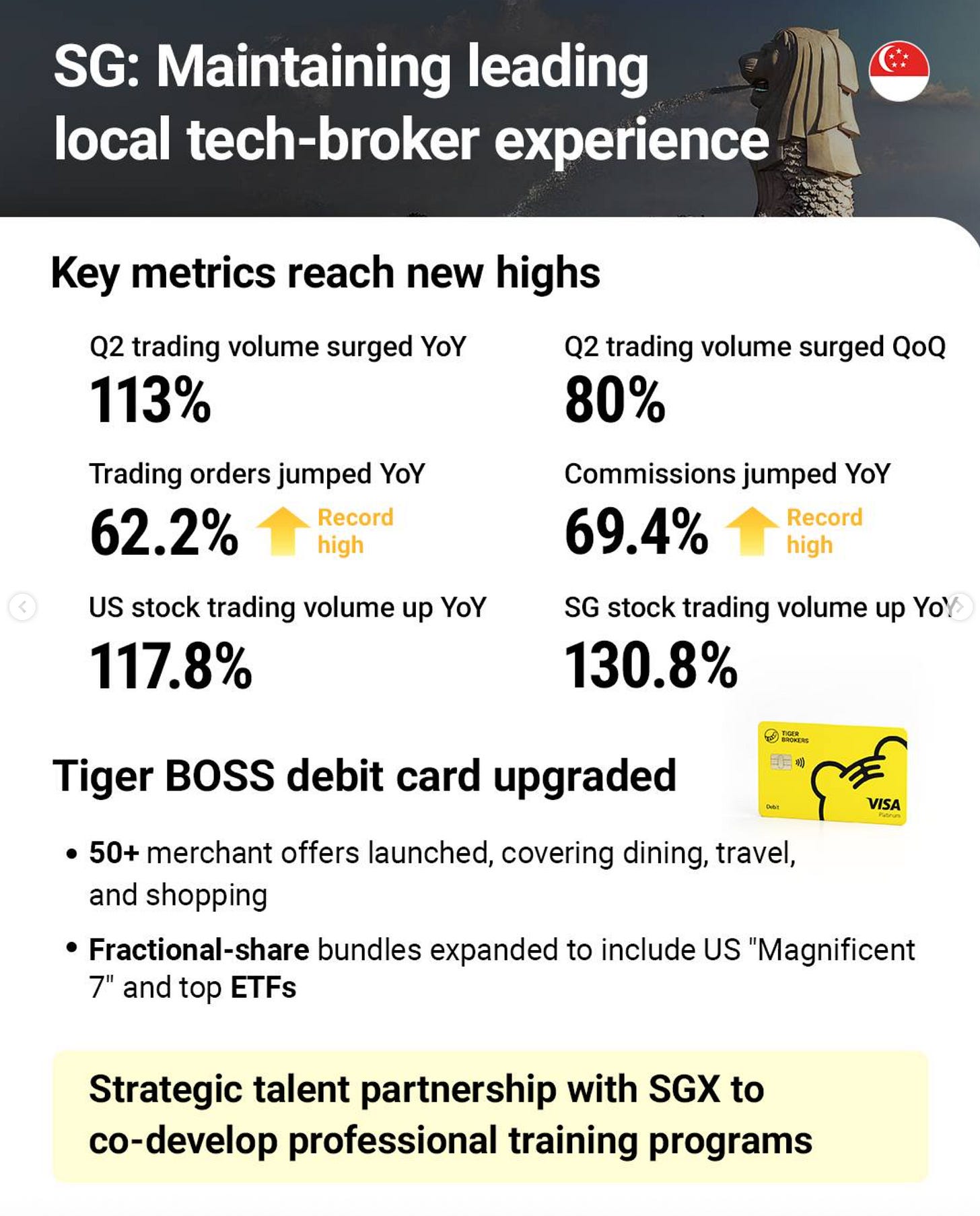 “On the institutional front, we launched a one-stop wealth management solution for major financial advisory firms and wealth management entities in Singapore. Addressing the industry's current pain points such as complex client onboarding requirements, cumbersome account opening processes, limited trading options, and low transaction settlement efficiency, Tiger introduced its next-generation Turnkey Asset Management Platform (TAMP). This platform offers flexible account structures, fully online account opening, multi-market and multi-asset trading, extensive analysis and trading tools, and diversified reporting. In 2024, we continued to strengthen our position as a premier platform for financial advisers and external asset managers in Singapore. Our strategic efforts in expanding institutional partnerships led to a significant increase in both the number of onboarded advisers and total assets under custody (AUC). The AUC in 2024 doubled year-over-year compared to 2023, reflecting strong client engagement. Looking ahead, we remain committed to strengthening our financial advisers and external asset managers ecosystem by expanding our network of institutional partners, introducing tailored investment solutions, and continuously enhancing platform capabilities. Our focus remains on driving sustainable growth while delivering best-in-class services to our institutional partners.“ - 2024 Annual Report