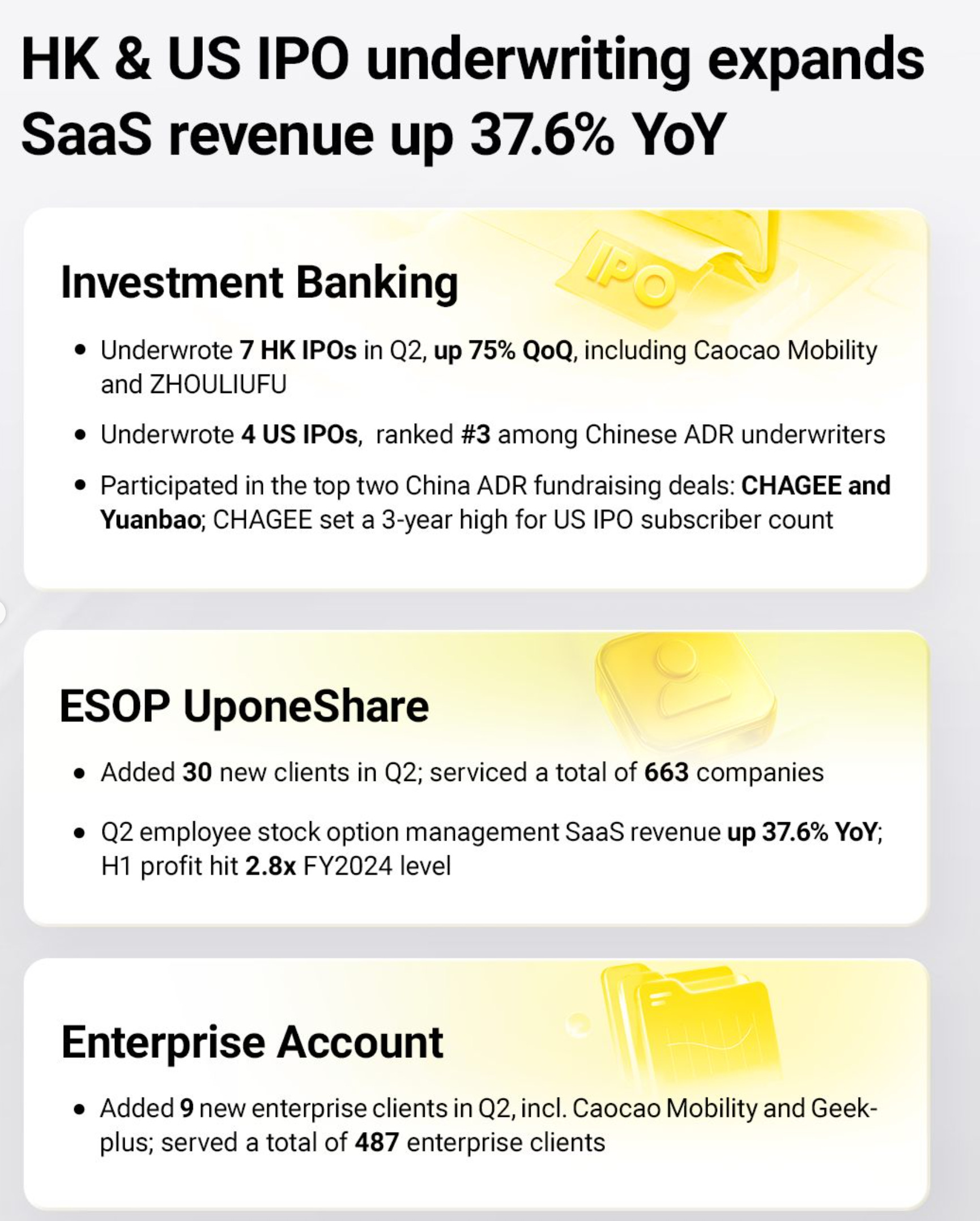 “Furthermore, IPO distribution is also an integral part of our comprehensive services package and is a major focus for our future growth. […] Underpinned by the brokerage services, we have successfully expanded our product offerings to ESOP management, IPO distribution, and wealth management. These integrated product offerings are highly synergetic and have significantly increased the average revenue per user and customer lifetime value.” – 2024 Annual Report
