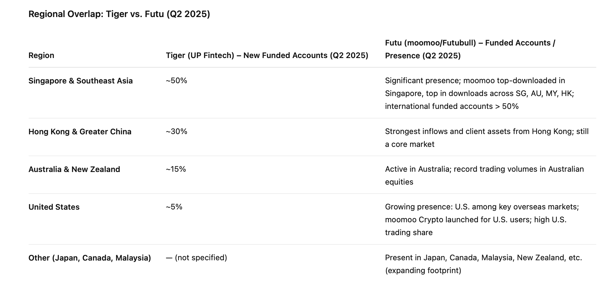 BAM: Over 70% of new funded accounts now come from outside the Greater China area, and the international business is higher-margin, higher-ARPU, and growing faster than the legacy base (“For the first question about the regional breakdown of new funded accounts, in the second quarter, about 50% of newly funded accounts came from Singapore and Southeast Asia region, approximately 30% were from Hong Kong and the Greater China area, 15% from Australia and New Zealand market and around 5% from the U.S. market.“ – Q2 Call).