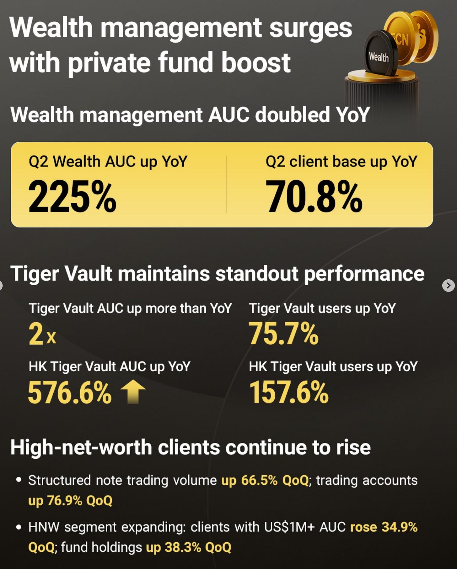“Product experience has always been the key to Tiger's long-term success. Web 3 is still a relatively new area compared to the traditional Web 2 trading. We are committed to maintaining Tiger's high standards in product functionalities. To further these efforts, we have partnered with seasoned strategic investors in the Web 3 ecosystem, who are also pioneers and successful entrepreneurs in the early days of the digital asset exchange. So by combining their expertise with our experience in Web 2 fintech, we aspire to jointly develop leading-edge digital asset trading products that will stand out in the global market. Although this business still accounts for only a small part of our total revenue, we are seeing strong growth, especially as we keep expanding in Hong Kong and roll out industry-leading features, like digital asset deposit and withdrawal.