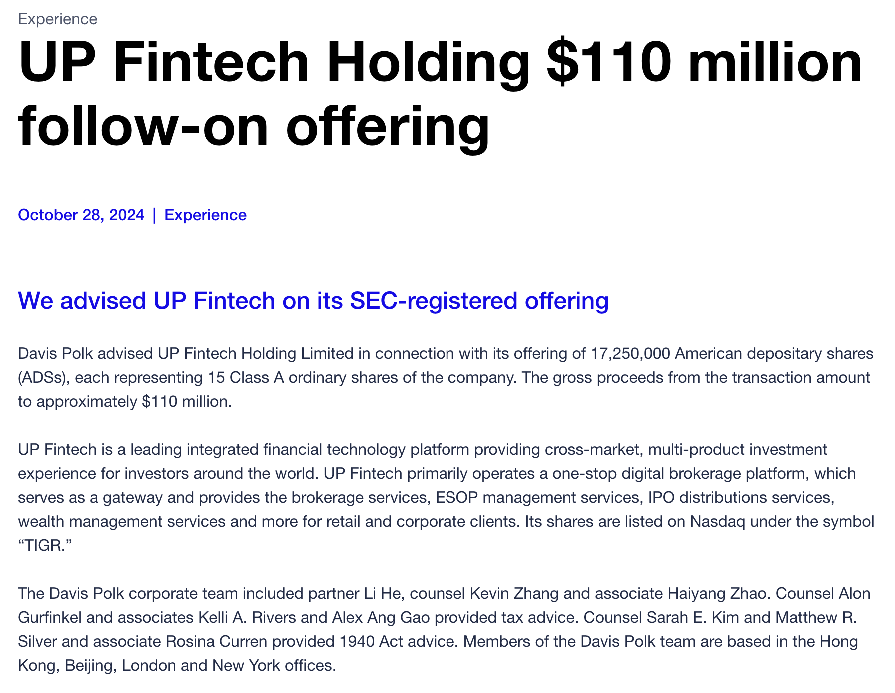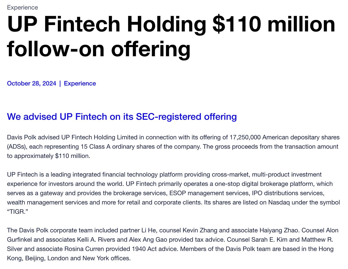 These enterprise relationships often start with financial services but can open the door to broader integration with Tiger’s ecosystem.