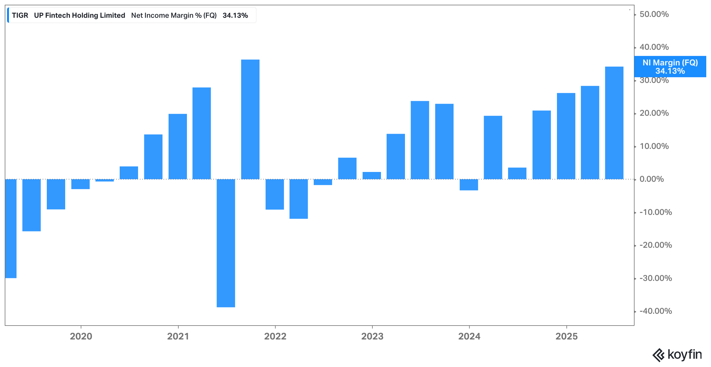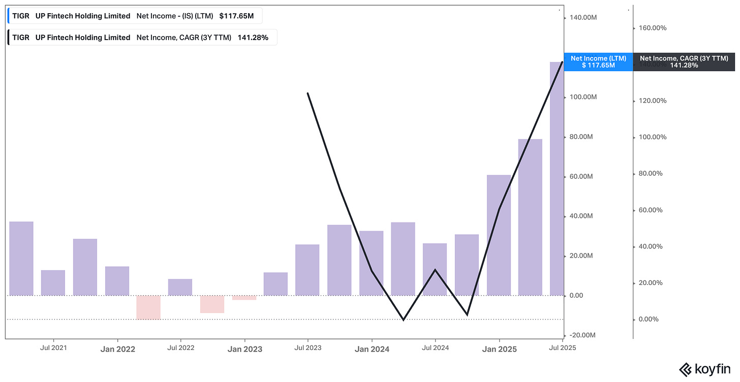 It’s a business that, in some ways, resembles Robinhood – a retail brokerage catering to the next generation of investors – but at a fraction of the valuation. Where Robinhood trades at a premium despite slowing engagement, Tiger’s profitability is accelerating, yet the market still treats it like a risky China-exposed play.