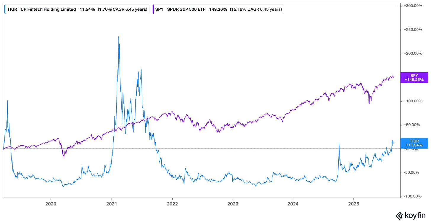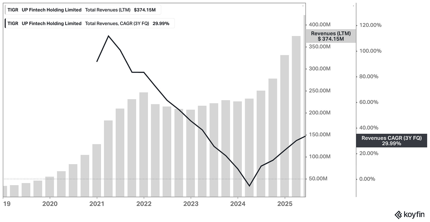 So here’s my attempt – not to oversimplify, but to crystallize what makes UP Fintech (Tiger Brokers) interesting right now, after a 240% run in twelve months: