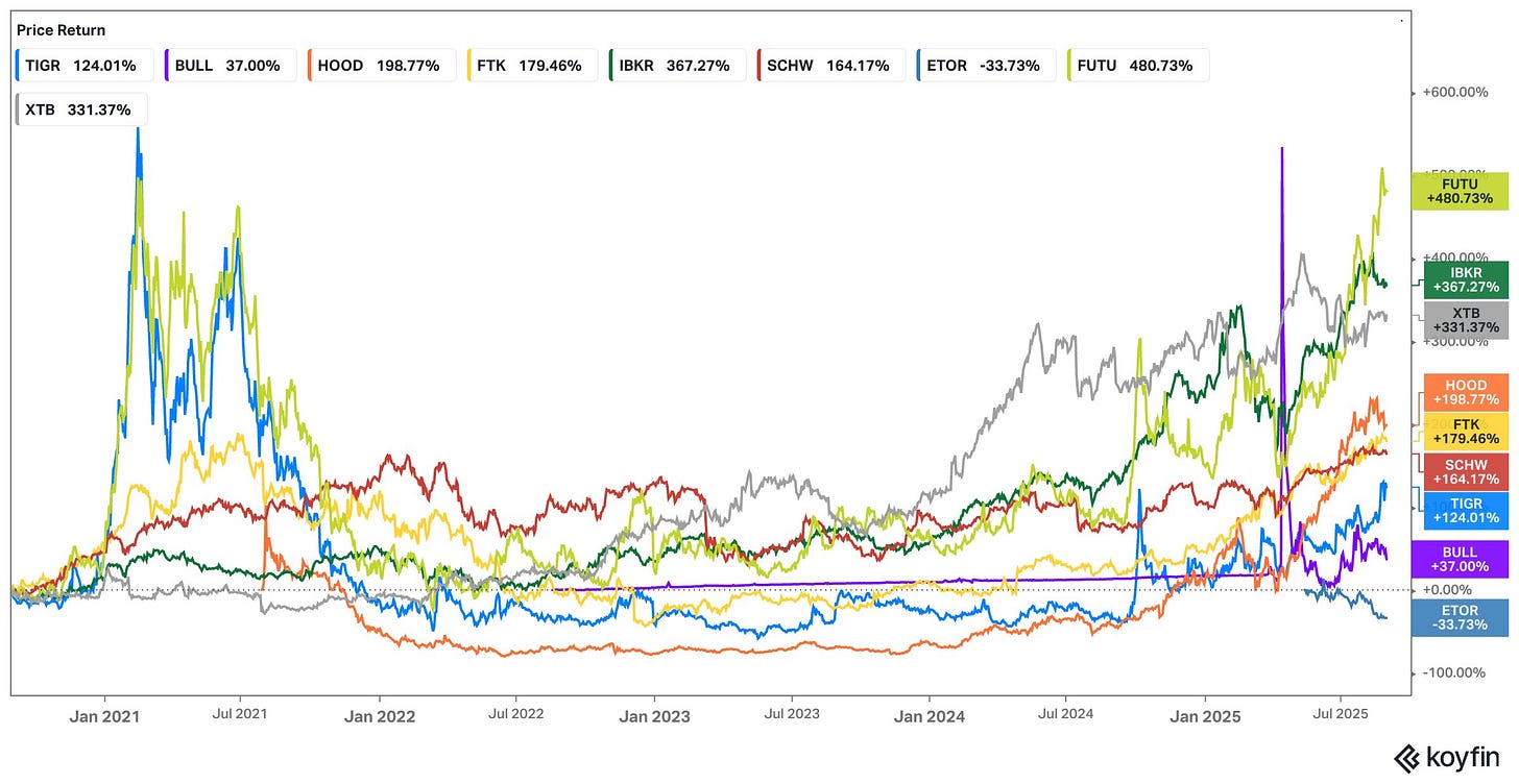 Even Interactive Brokers, a far more mature player, sits around 4.9x, and Futu, Tiger’s closest regional comp, is at 12.5x.