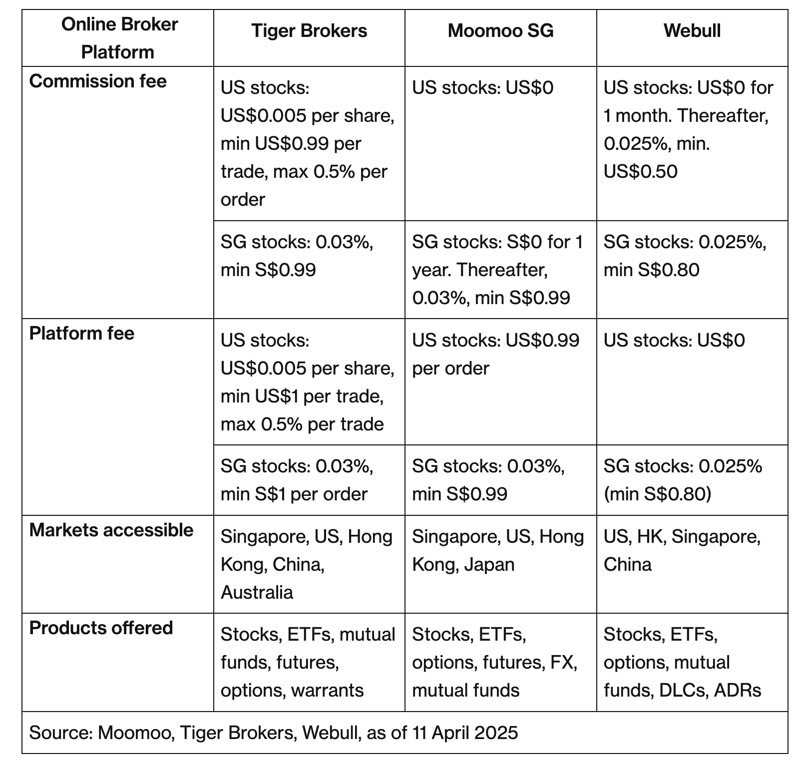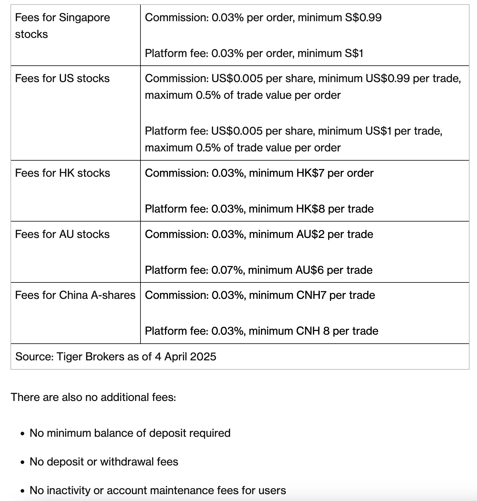 I found this article (“Tiger Brokers Review (2025): My likes and dislikes of this trading platform“) helpful in getting a decent grasp on the various fees charged, and in understanding the value proposition of Tiger (Easy-to-use application, Access to multiple markets and products, Low commission fees, convenience features like "auto invest" features).