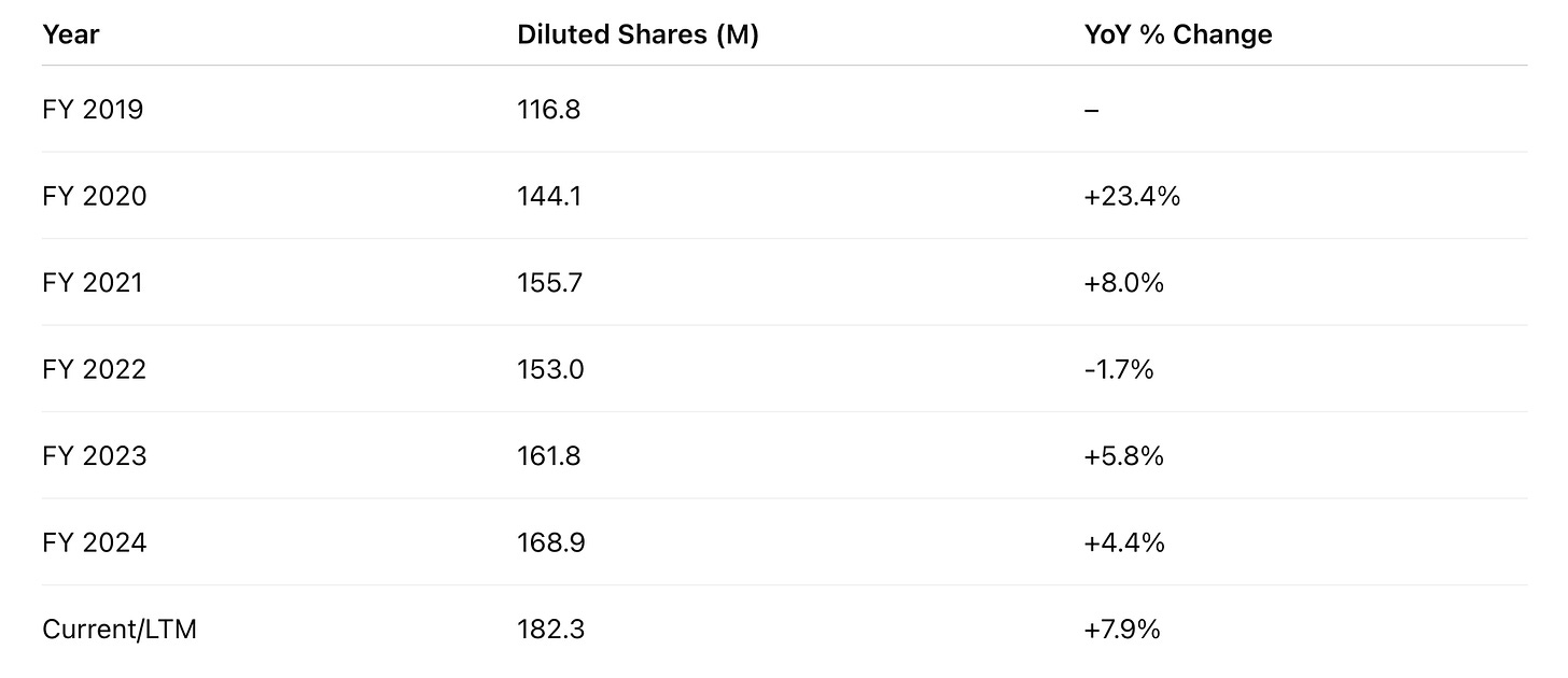 Additionally, if you look back at the table we built, diluted shares grew from 116.8m in FY2019 to 182.3m today – more than 55% higher in six years, which works out to a ~7.6% CAGR. Even if that moderates going forward, it’s fair to expect dilution will continue to chip away at per-share growth.