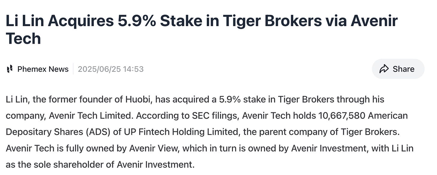 Another noteworthy development on the shareholder front came from outside the company’s management team. Li Lin, best known as the founder of HTX (formerly Huobi), recently disclosed that he has significantly boosted his stake in Tiger Brokers, increasing his position by nearly 290%.