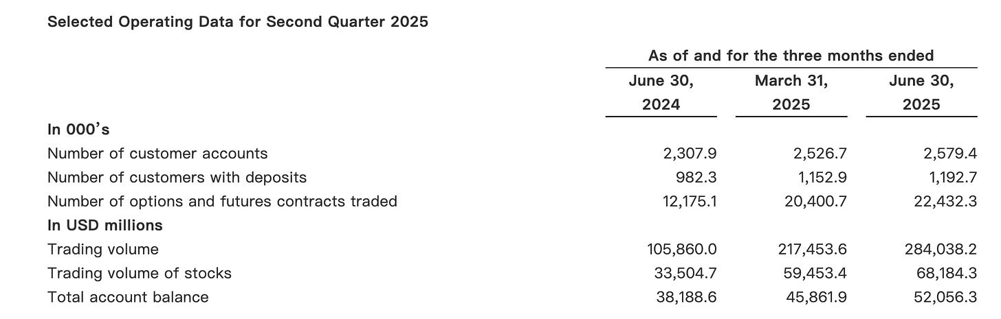 In Q2, Tiger reported $52.1 billion in total client assets (“up 13.5% quarter-over-quarter and 36.3% year-over-year, marking 11 consecutive quarters of growth”) and about 1.19 million funded accounts, which works out to an average account value of roughly $43,700.
