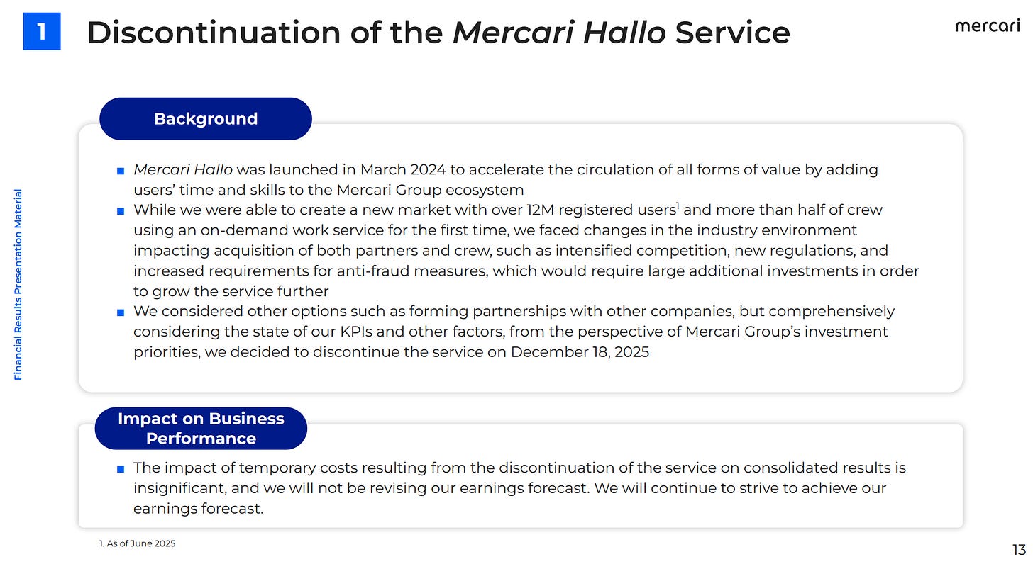 That assessment aged better than I expected. In late October, I came across a report by Nikkei that highlighted how Mercari would shut down Mercari Hallo in December, just two years after launching it.