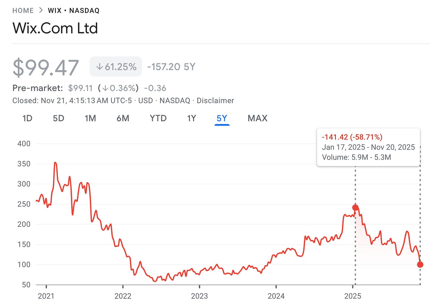 But even then, I thought the stock had probably overshot to the downside. What I didn’t expect was that Wix would revisit the $100 level ever again, let alone in late 2025, after multiple quarters of accelerating fundamentals. And yet here we are. Wix now trades below $100 a share, back to a level last seen during the late-2023 reset, almost two years ago.